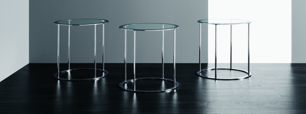 Κλασικό στρογγυλό τραπέζι από χρώμιο με γυάλινη επιφάνεια.