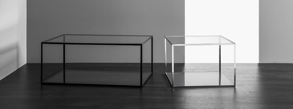 Κλασικό τραπέζι σαλονιού με τετράγωνο σχήμα από χρώμιο ή μαύρο μέταλλο, με γυάλινη επιφάνεια και πάτο.